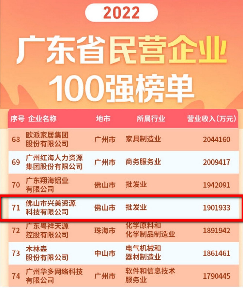 喜報(bào)!興美資源科技公司榮登2022年廣東省民營百強(qiáng)!